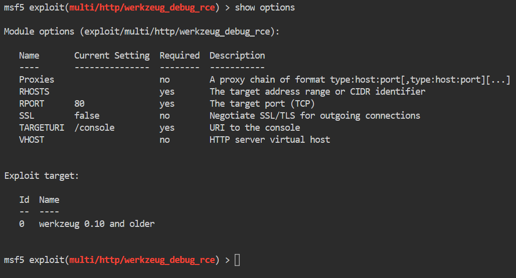 We look for our required fields. We have a required field of rhost, rport and targeturi. We set each accordingly. In this case we only need to set the rhosts parameter.