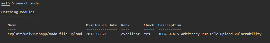 Looks like we have an XODA module built in, lets see what it yields. The first thing we do is use the exploit.