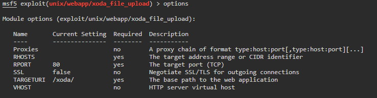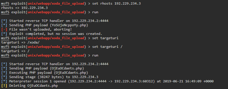 We run it but we get back an error, ‘File wasn’t uploaded, aborting!’ hmmm, why? Well, if we look at our options above, we see that the target URI is pointing to /xoda/. Meanwhile, our scan shows that XODA is hosted in just root or ‘/’. So lets change that.