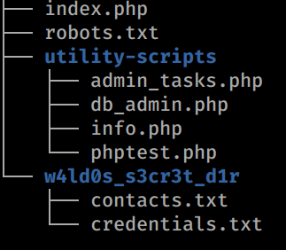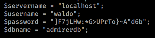 This is the portion of the site that we find the most usefull. If we look at this robots.txt we see it’s the same as the ’live’ version, with one minor difference. In the dev version of the site the /admin-dir is called w4ld0s_s3cr3t_d1r. If we try to go to /utility-scripts location on production, we see it is forbiden, so it does exsist. We look a the index.php file as well, and see some hardcoded credentials as well as a database name.