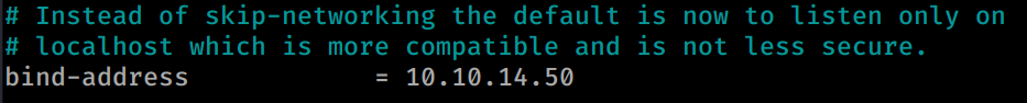 Now that our user and DB is created we need to modify our Bind address for our server. If we don’t do this you will get Connection Refused from the Adminer.php page. Inside the 50-server.cnf file we can change this to our HTB issued IP: