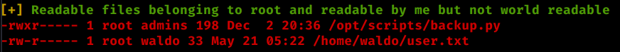 Sure enough we find a combo that works - Waldo:&<h5b~yK3F#{PaPB&dA}{H> We log in via SSH and get our user.txt flag! Now that we’re in, we need to enumerate internally. In this case we’ll copy over linPEAS and see what it shows. We see these two entries that are paticularly interesting: