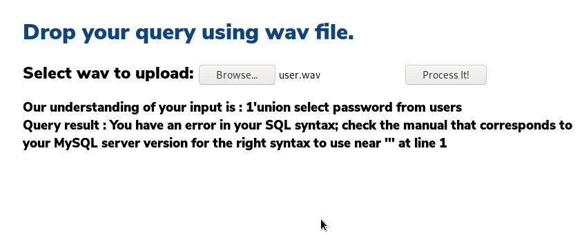 Now we’ll start visiting these pages to see if there are any paths forward. We see that the premise of the site is using voice recognition from audio files as a search engine. On the ai.php page we see there is an upload form requesting a .wav file. So we’ll upload a sample file and see what happens. We get a response: