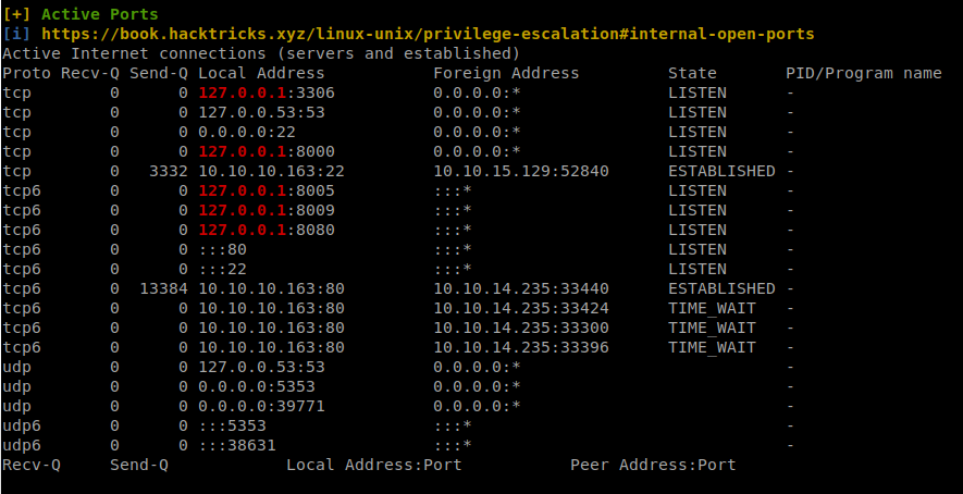 We are in. We snag our user.txt flag and start enumerating for root. We sping up a SimpleHTTPServer and download Linpeas.sh onto the box. We see that there are few more open ports available to us: