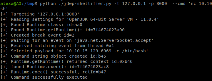 It seems to execute but we never catch a shell via netcat. Let’s craft a payload with msfpc or msfvenom. We issue msfpc elf tun0 to generate a Linux payload. We can then copy this payload to the server under /tmp. Then we will launch our MSF listener and retry our payload. Still doesn’t work. After some furthre digging it was suggested to try a different Java method to hook from. We’ll use a pretty basic one of java.lang.String.indexOf. This time we run it and get a shell!