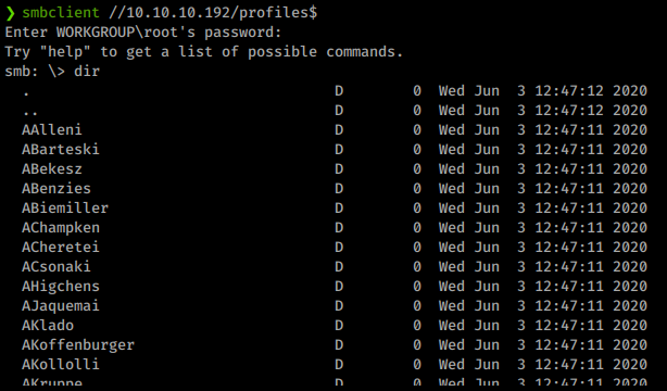 Most commands are denied. We will try to connect to forensic and profiles$ anonymously.
