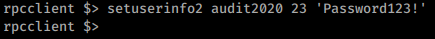 Once connected we see that we have more permissions, obviously. We can now queryuser support and enumprivsthis will give us what our permissions are listed as. After some trial and error of commands it seems we can use setuserinfo2 to change passwords