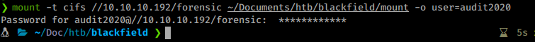 mount -t cifs //10.10.10.192/forensic ~/Documents/htb/blackfield/mount -o user=audit2020