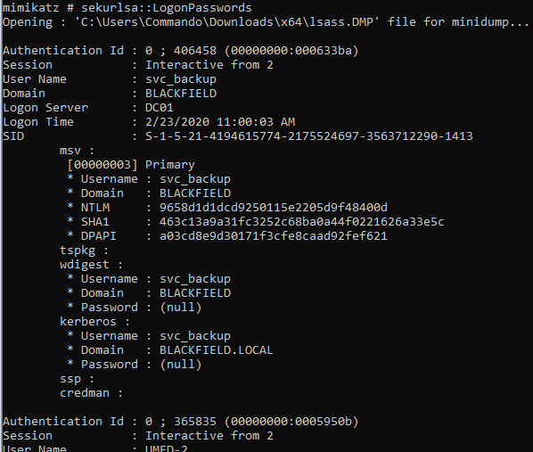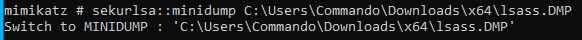 sekurlsa::minidump C:\Users\Commando\Downloads\x64\lsass.DMP