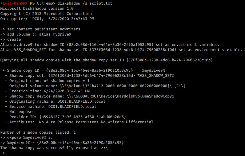 We can hopefully use diskshadow to run our script and get the ntds.dit file from the domain controller as shown on slide 23 of link two.