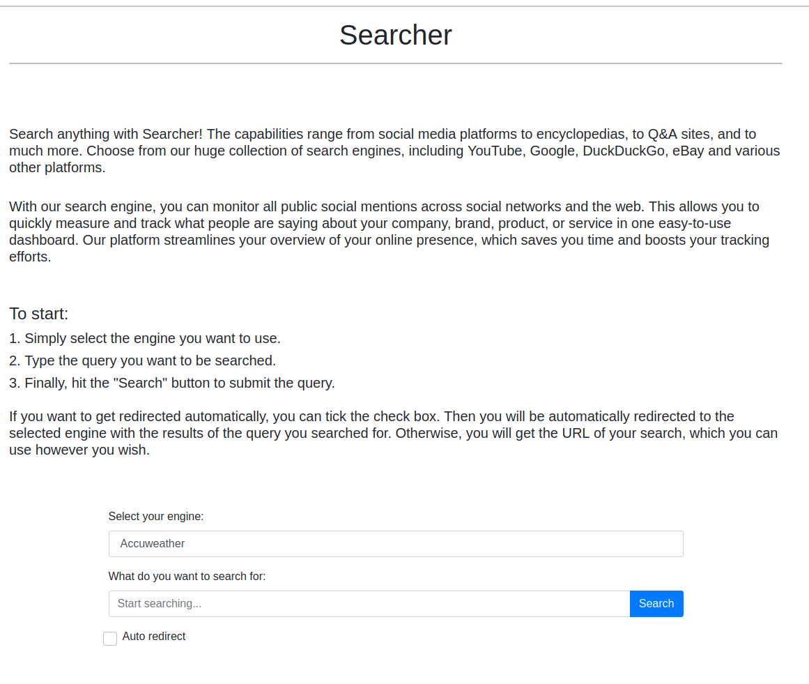 Well, with only two options for ports, let’s see what’s on the web port. We add searcher.htb to our host file and see what’s there.