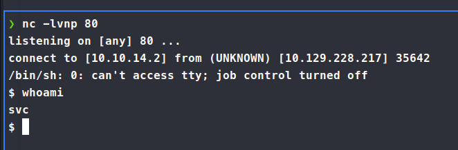 We get a connection back as svc. We’re also able to grab the user.txt flag while we’re at it!