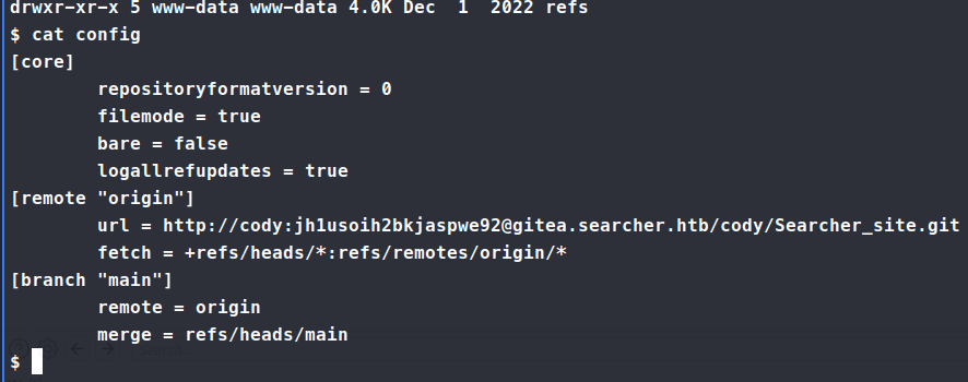 Going back to /var/www/app we start digging through the .git contents. In order for us to be able to get to the gittea site, we need to be able to proxy our traffic through via ssh. So we check the contents of the config file here and see some credentials.