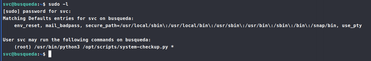 The password didn’t work for cody gut they did work for svc. We’re now able to do a bit more via ssh. Now when we run sudo -l we see that we can leverage something.