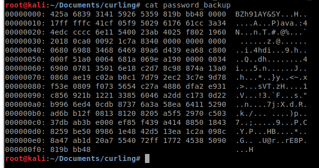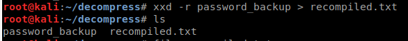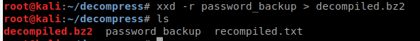 It seems to have a header of BZh91AY&SY which means its could be bzip file type. So lets try and recompile this hexdump. The tool hexdump wont do that for us but xxd will! We will issue xxd -r password_backup > recompiled.txt.