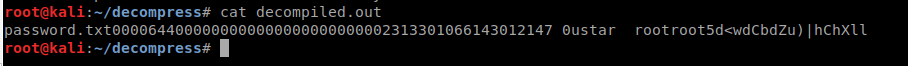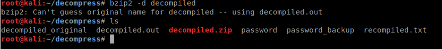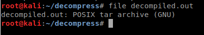 It gave us an output file of decompiled, this is why we needed to rename the original. When we look at the file we end up seeing its back to a .bz2 file. When we extract that file, we get an error as well as a .out file.