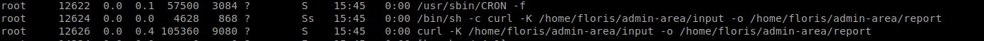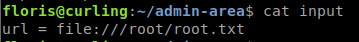 A cron job runs that calls a curl command using data from the ‘admin-area’ directory we saw earlier. When we look we have the -K which tells curl to use an input file and -o to give an output. So what we will try to do is modify this input file to get what we want. When we look at the contents of ‘input’ we see it’s pointing to a URL of the local host.