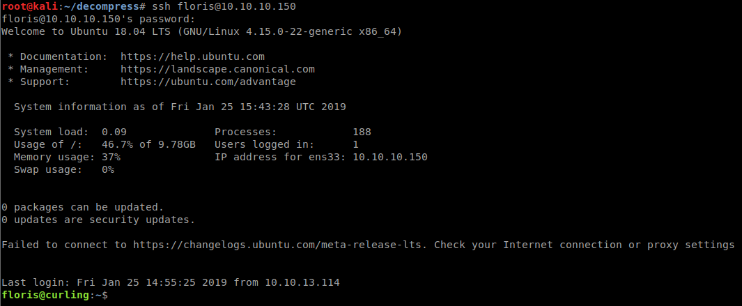 Now we just need to figure out what this is for, could it be a password? Lets try it, nope not a password. When we look at it, it looks like it might be a possible base64 given that it it has 4 sections of 4 characters its simply missing the = at the end. Worth a shot, lets try. Sure enough, it is! We get the result of Curling2018!. Fairly close to what we had originally guessed. So lets try logging in as Floris using those credentials.