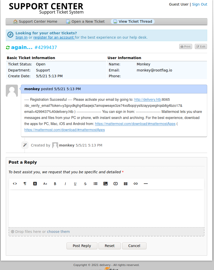 Here it looks like we are able to create an account for delivery.htb, or atleast some service associated with it. We create an account and it tells us to check our inbox for the link.