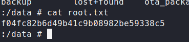 Now we are root, let’s go find that flag! Shortly, after some digging, we find it in /data/!