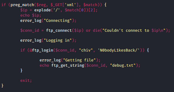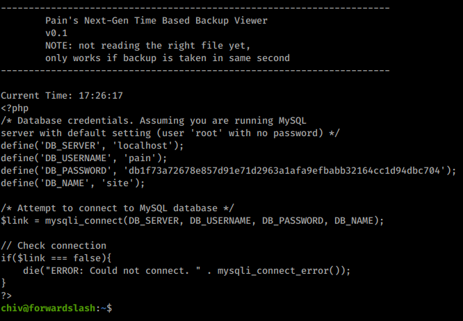 This works and we get our config.php content back. Inside we have some credntials for the www-data user. While we’re at it we’ll grab the conents of api.php and hof.php.