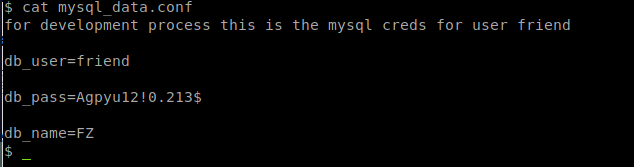 We are running the shell as the www daemon, so we’ll need some way to pivot. In this case, we’re going to see what we have in the www directories first. Since this is a CTF and not a live red team exercise ;). We see in www there is a mysql_data.conf. When we view it we get a username and password.