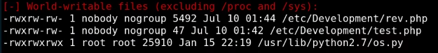 We might be able to do some root level cron job type things with this. We’ll load up LinEnum to enumerate the box and see what we can do. Oddly enough after it runs, we don’t see this python script being called in the cron jobs.