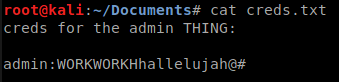 Cool, a file called ‘creds.txt’. This might be handy! We download the file and we cat the contents.