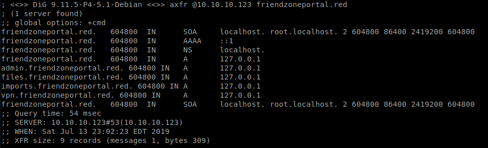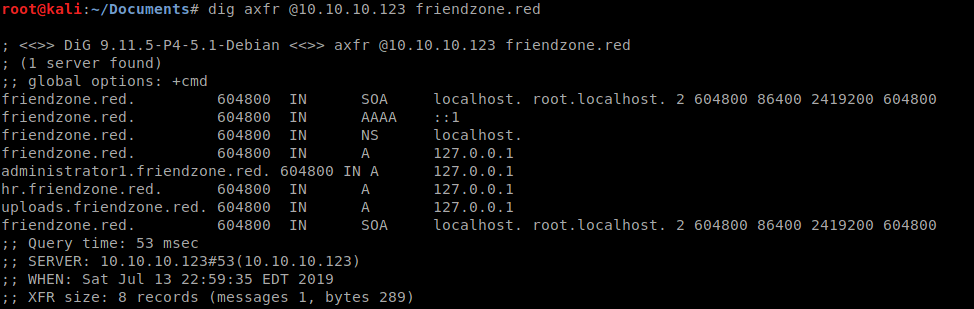 Right about here I was getting a little curious as to where to go next, as I reviewed my nmap scan for something I might have missed, I thought well why not DNS? I didn’t enumerate at the beginning thinking it was a potential rabbit hole. Since we seem to have two separate hostnames going on friendzone.red and friendzoneportal.red, we might be able to use dig to get some more info with a zone transfer. More about zone transfers here .