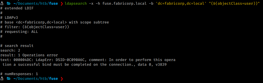 Next we try to use a basic ldapsearch to enumerate users but we are told we need to create a bind first. It’s telling us that we need to be authenticated.