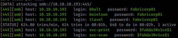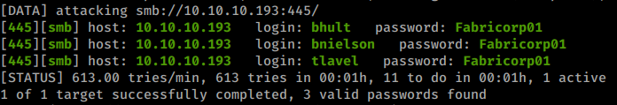 hydra -L users.lst -P wordlist.lst 10.10.10.193 smb