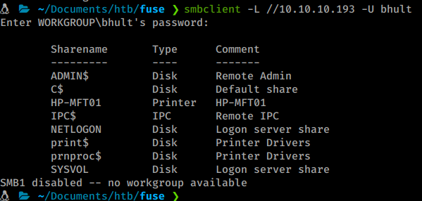 You’ll need to do the steps above quickly, as the password resets on the box. Once we do, we can quickly see our shares with a standard smbclient command: