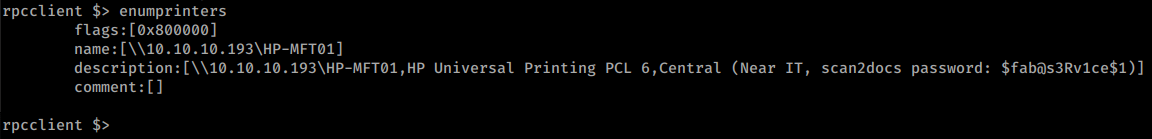 We can start to enumerate a bit more inside this connection. We issue enumprinters and see what might be listed. We see a printer and a password.