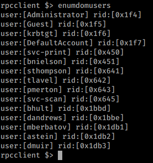 We can then take these rid’s and compare them to the output from enumdomusers to see who they are. Turns out they’re svc-print and sthompson. We can issue queryuser on the rid to see if there is any data stored in the users account, but there is none.