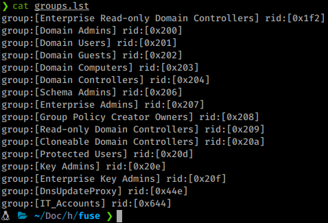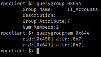 We now have a much larger listing of users. We’ll add these users to our list as well. We’ll also want to obtain the groups on the domain with enumdomgroups as well. We see one group of interest in particular - IT_Accounts.