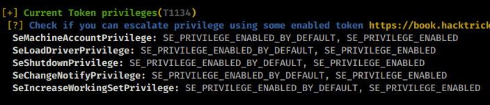 As we continue to look at our privileges from winPEAS we see the token privileges area has some unique attributes.