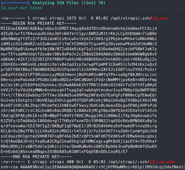 We copy out the RSA key located in opt/strapi/.ssh to our machine and connect with it.
