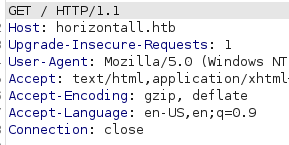 We see the request come throught to horizontall.htb, so we’ll add that to our host file.