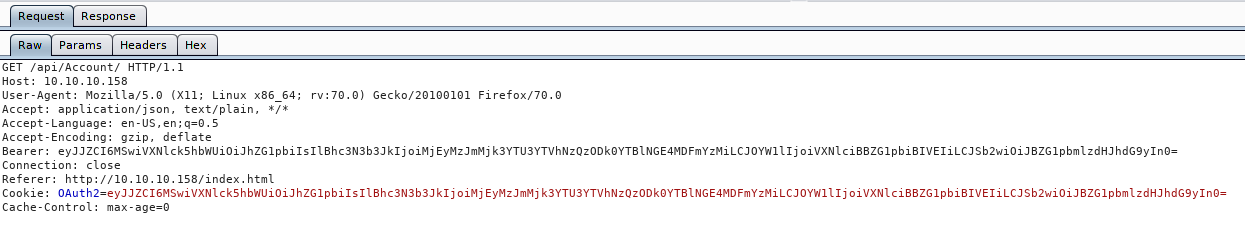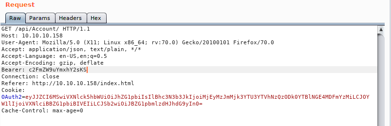 Parsing through the code we see that we have an API endpoint. /api, /api/Account and /api/token. We’ll use gobuster to enumerate possible enpoints more: gobuster dir -u http://10.10.10.158/api -w /usr/share/wordlists/dirbuster/directory-list-2.3-small.txt -t 40.