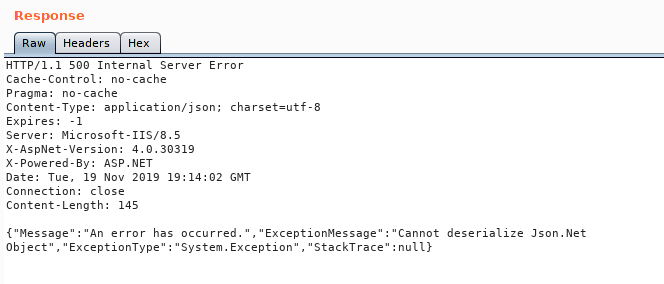 At this point we will want to fuzz the API and see if there is anything it doesn’t really like. We should also try crafting our own JSON payload to see what works. The first thing I do when I start fuzzing something are the low hanging fruits. Things like changing the request types, referer, cookies and bearer values. In this case when we change the bearer value, we get a deserialization error.