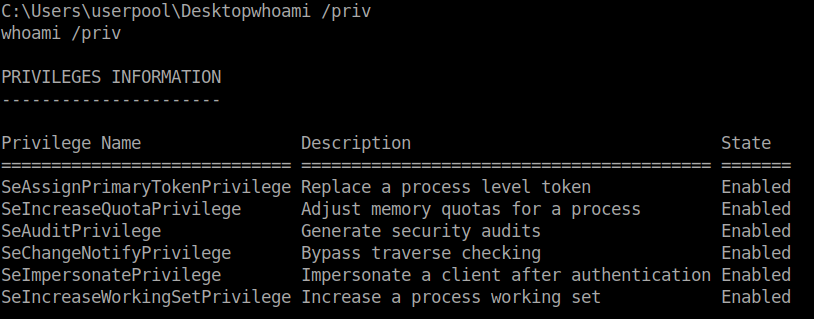 We also see that we have SeImpersonatePrivilege and SeAssignPrimaryTokenPrivilege set to enabled. We can leverage the idea of RottenPotato