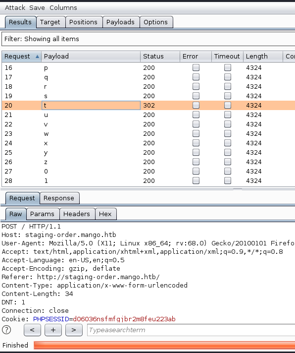 As you can see in the above image, we’ve appended the previously found ’t’ to our url. Rerun the attack and our next character is 9. We’ll repeat this process until we have a full password: t9KcS3>!0B#2. We repeat the process for user mango as well. Turns out there is a user with password of h3mXK8RhU~f{]f5H.