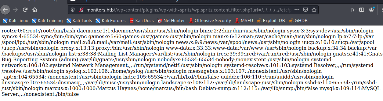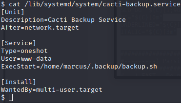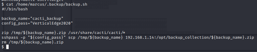 Inside this file, we have another username / password combo. We know that the user cacti_backup isn’t a thing, so we try to SSH in as marcus with the above password, and we are in!