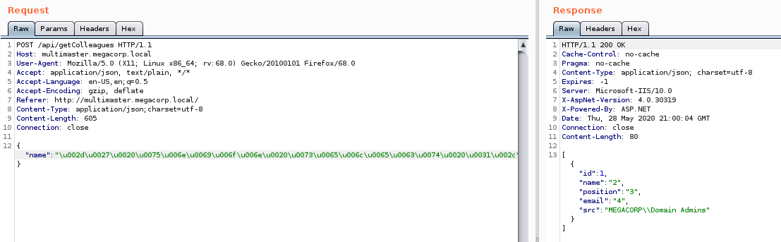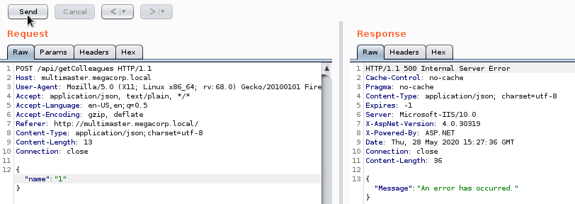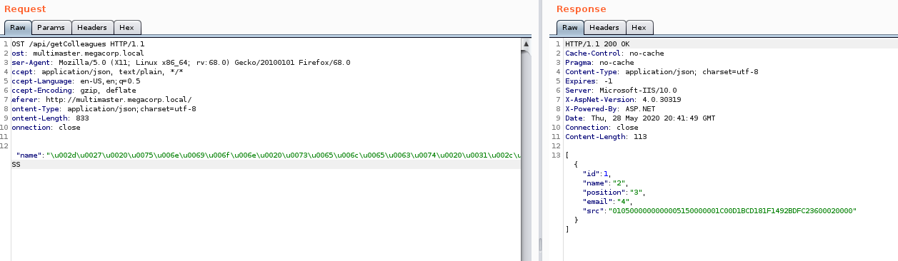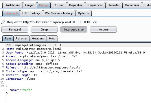 When we look at the request on the search page, we see that the POST is sent to /api/getColleagues. The /api url is something we might want to fuzz as well.